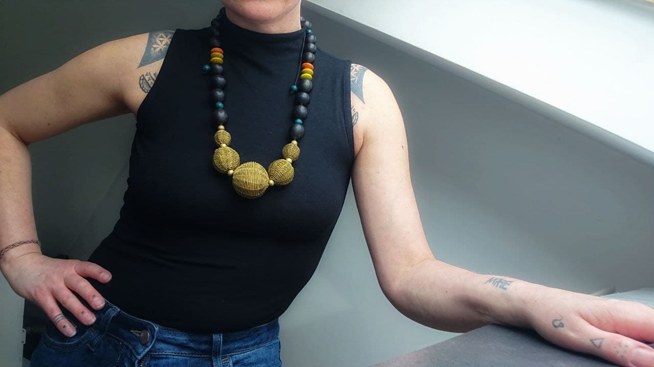 A personal favourite and one I'll find it hard to part with. Gold tone woven wire beads sit at the centre of this piece and taper off into smaller dark brown, almost black wooden beads. A few licks of colour have been placed along the neckline adding beautiful contrast.