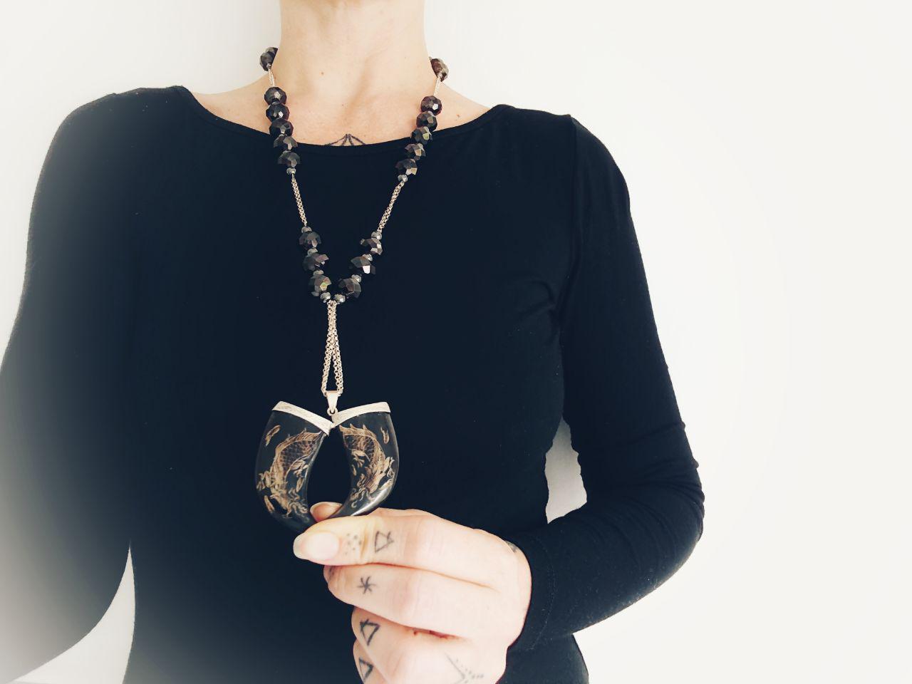 When this dragon pendant came into my upcycling service I knew this piece would be special. Hung from sterling silver chain with alternating statement black faceted beads and smaller hematite beads adding a perfect contrast to the silver.