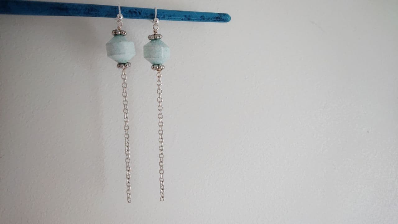 These are such elegant earrings. A single delicate blue bead sits at the tope of this earrings with a single strand of silver tone chain.