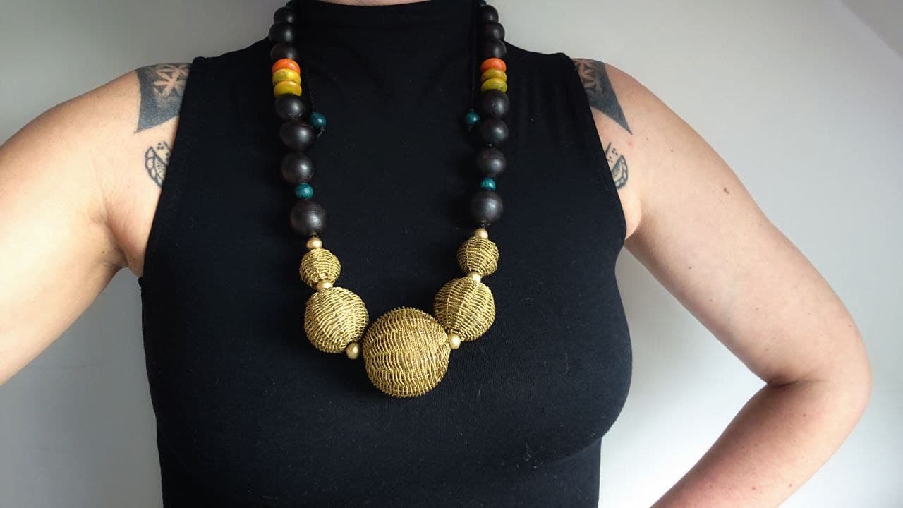 A personal favourite and one I'll find it hard to part with. Gold tone woven wire beads sit at the centre of this piece and taper off into smaller dark brown, almost black wooden beads. A few licks of colour have been placed along the neckline adding beautiful contrast.