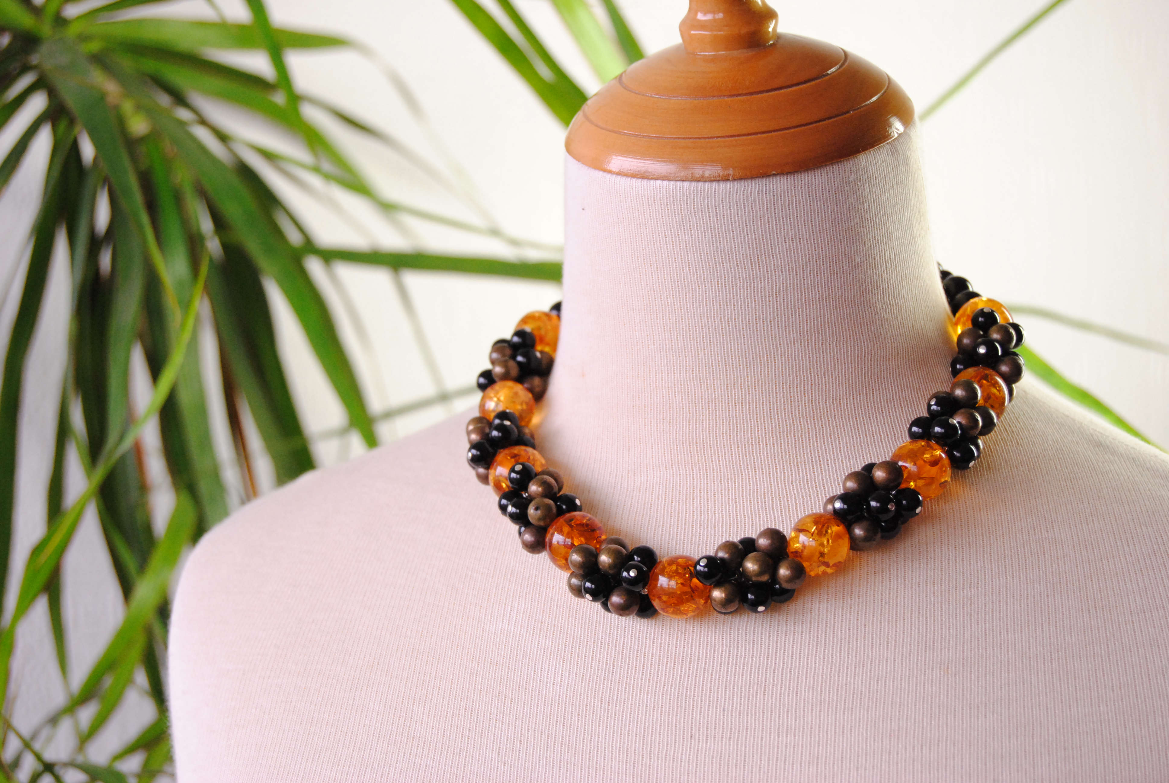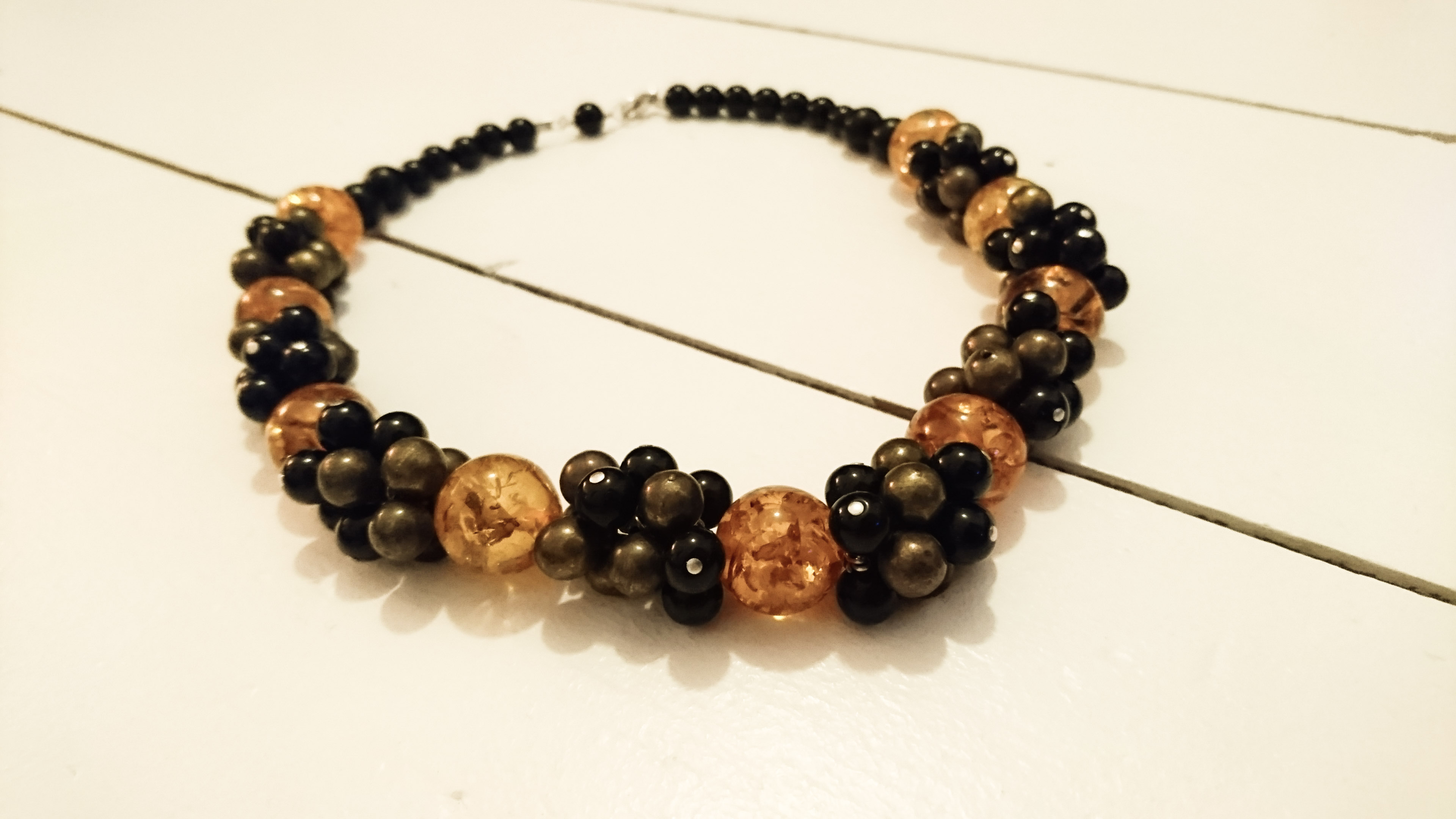 I handmade this necklace using small bronze coloured beads and black plastic beads which were taken from a broken elasticated charm bracelet. I’ve teamed it with complimentary copal beads which I had left over form another project I was working on.