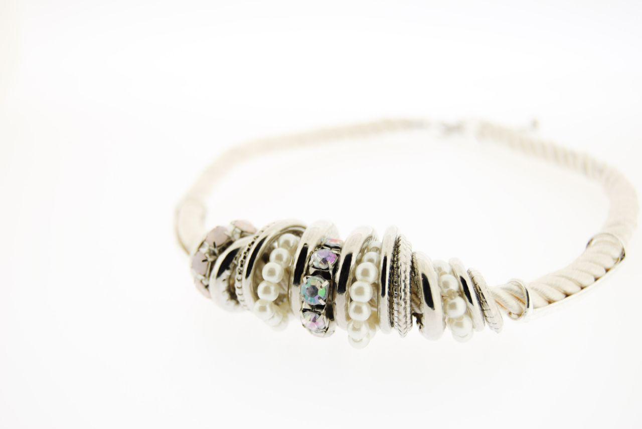 18 silver and white coloured ring charms sit at the centre of this pretty white twisted rope necklace. The necklace has 2 large silver coloured tubular beads at either side of the rings and has been finished with a lobster fastener.