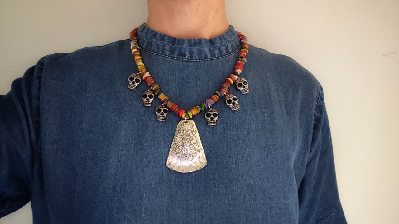 A bright statement piece which has been made from a mash up of 2 broken necklaces and an odd earring which is the central focal piece. 3 skulls sit either side of the middle pendant all hung from a brightly beaded rainbow necklace.