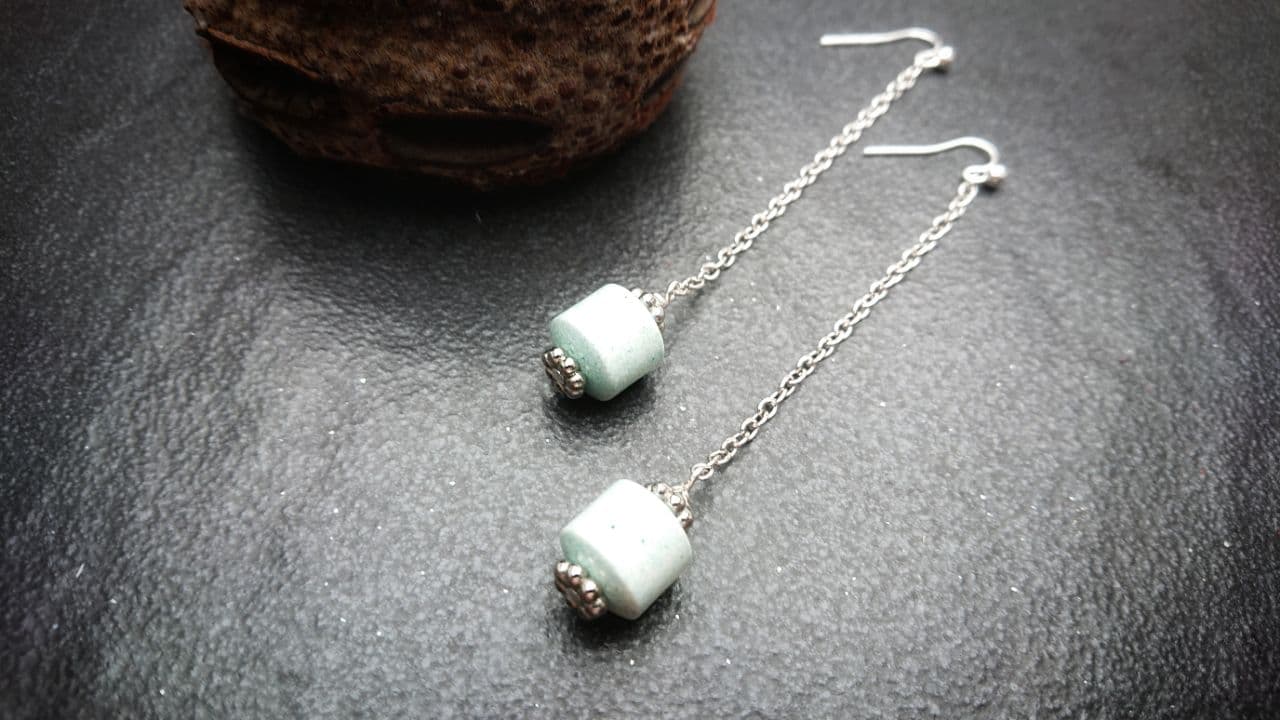 These earrinsg have .925 silver ear hooks so are suitable for sensitive ears. The chain, wire and charms used are silver plated. A single delicate mint ceramic stone sits at the bottom of an elegant cable chain.