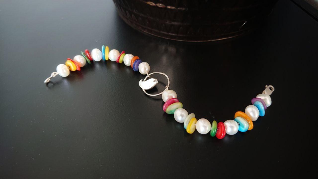 These Freshwater pearls were left over from a bridal collection I worked on many moons ago. I've spaced them with these dyed rainbow shells and placed the cute bird pendant at the centre of the piece.