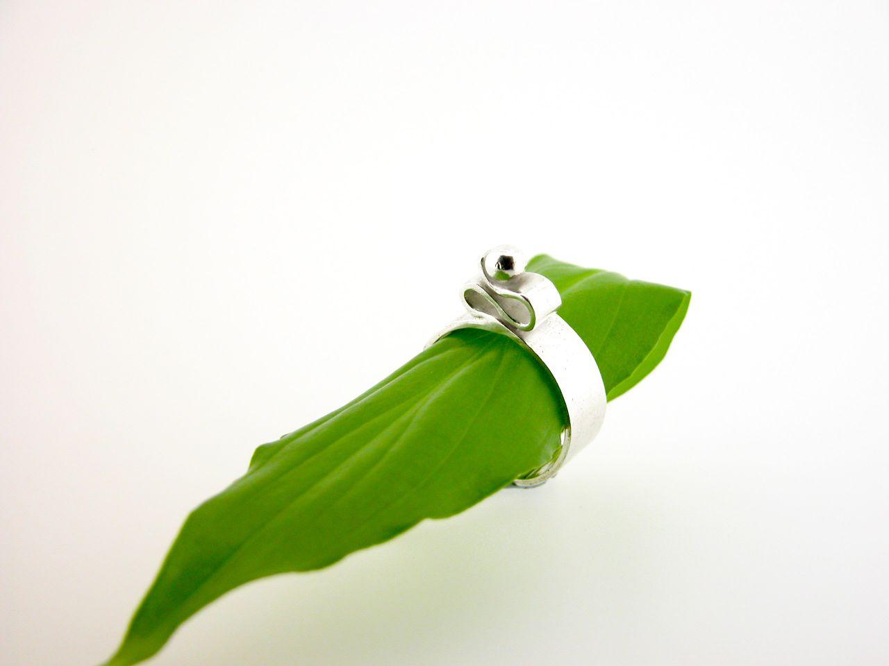 I handmade this piece from recycled fine silver. A single ball sits on top of an elegant swirl and thick banded shank.